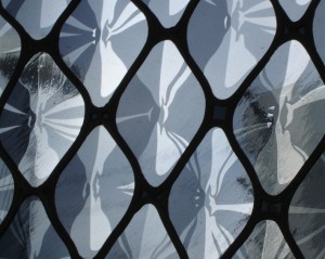 Mittels Flusssäure ätzen wir die farbigen Überfänge (dünne farbige Glasschicht auf meist durchsichtigen oder getönten Echtantik-Gläsern) ganz oder stufenweise weg